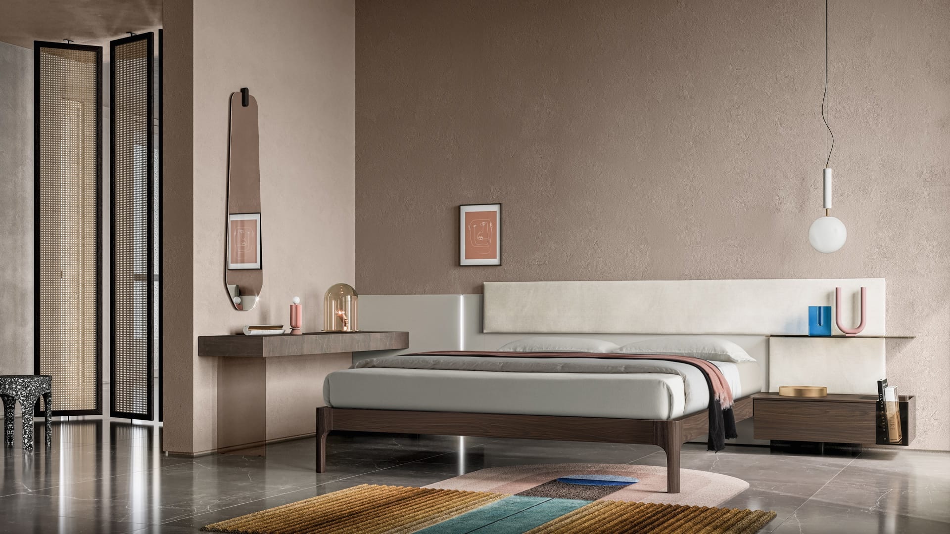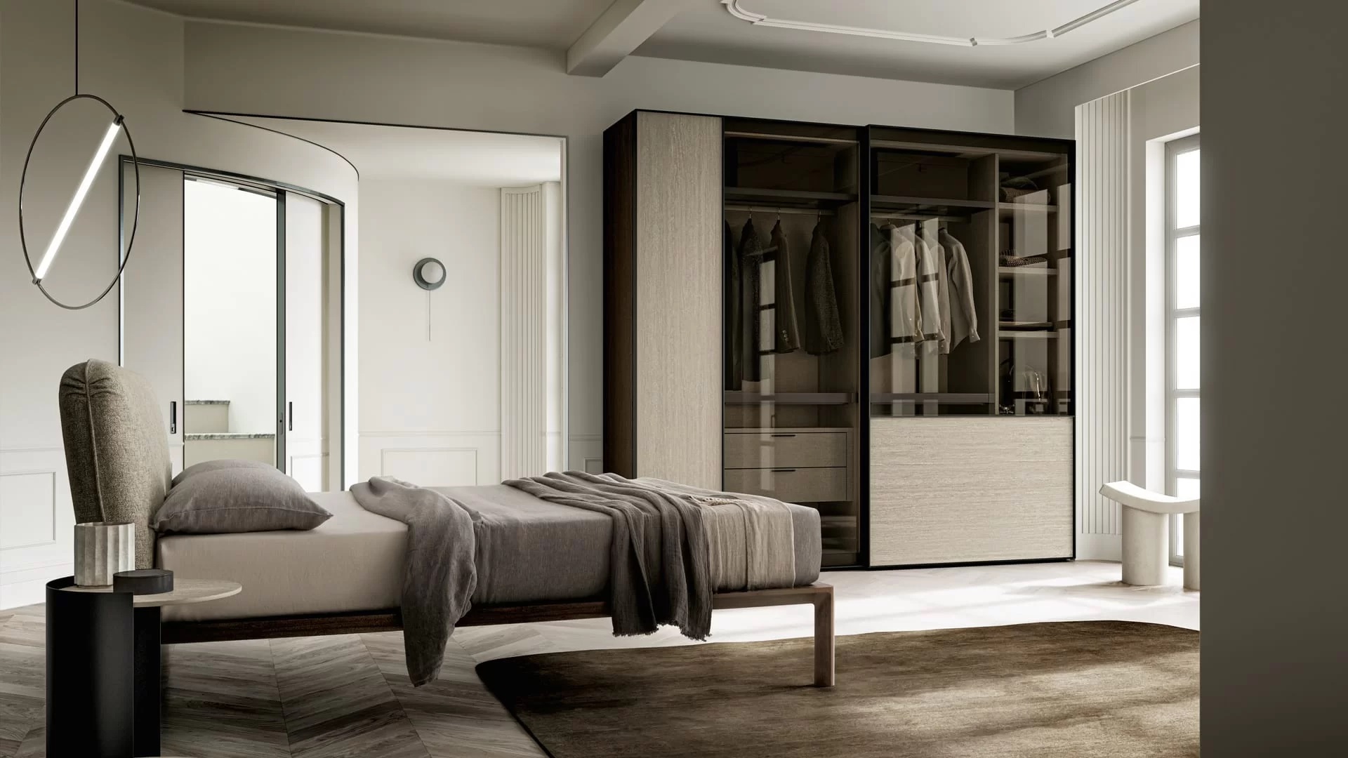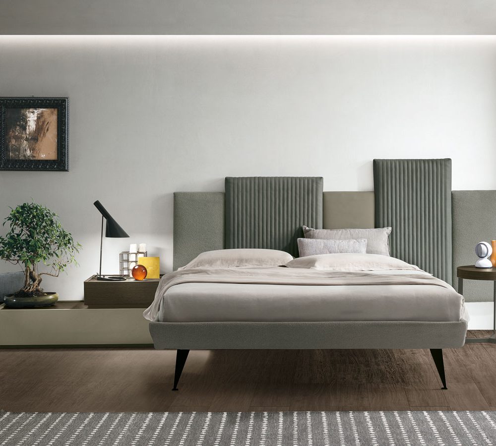 Gli arredi della zona notte si ispirano a linee contemporanee, creando un equilibrio armonioso tra forme eleganti e materiali raffinati.